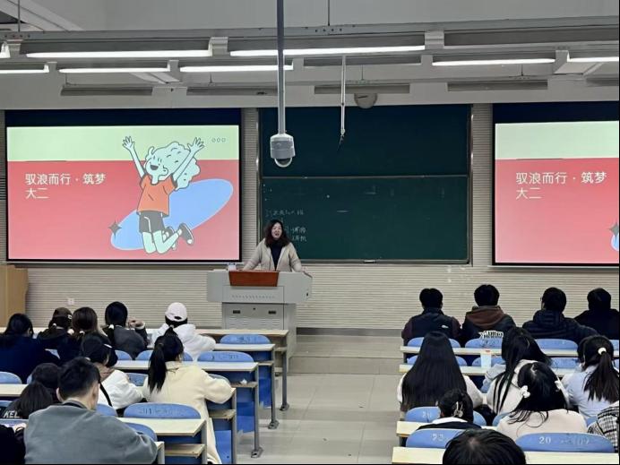 接下来,魏雨围绕大二这一“承上启下”的关键学年,开展学年规划专项指导。她结合往届学生的典型案例,在学业深耕、实践赋能、自我成长三个层面上提出具体要求:在学业方面,需夯实专业基础,提前研判考研、就业对核心课程的要求,合理分配必修与选修课程的学习精力;在实践方面,倡导学生结合专业方向参与学科竞赛、科研课题及志愿服务活动,积累专业实践经验;在成长方面,要建立周期性复盘机制,按月梳理目标完成进度,动态调整规划方案。最后她强调,大二是职业生涯探索的关键窗口期,同学们要主动对接学院教师资源,充分利用就业指导中心这一平台,提早明确个人发展方向。